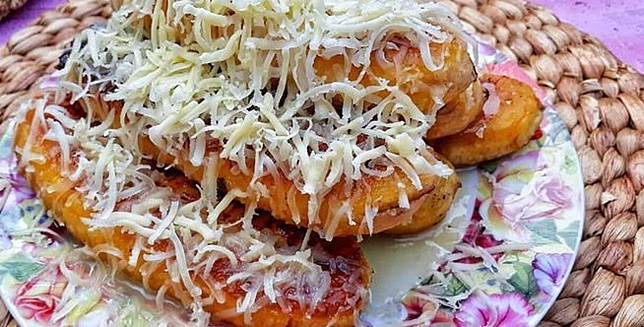Tuang kepiring, susu kental manis putih, parutan keju berlawanan dengan pisang raja, pisang kepok justru memiliki bentuk paling lebar sehingga mudah.